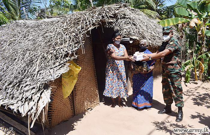 Needy families in Muneikadu South at Kokkadicholai, Batticaloa district on Friday (11) received dry ration packs and lunch packs, each dry ration packet, worth of Rs. 2500/= after arrangements to this effect were launched by Brigadier Vijitha Hettiarchchi, Commander 231 Brigade of the 23 Division under the SFHQ-East.