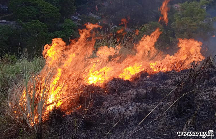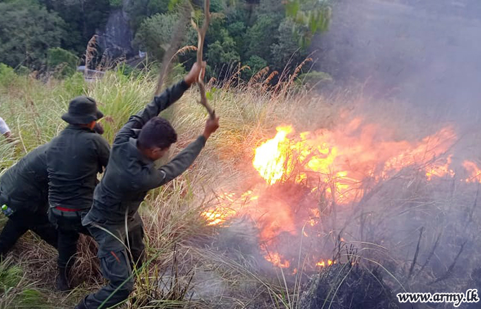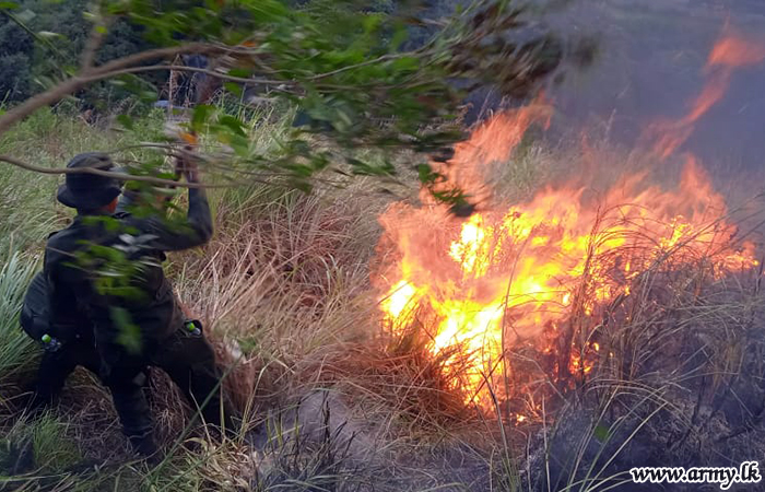 Troops of the 112 Brigade of the 11 Division under the Security Force HQ-Central brought a wildfire that spread across Abadhandegama Mountain range in Dowa area in Bandarawela in Badulla District under control on Thursday (17). Earlier on Sunday (13), a wildlife that erupted atop the Wewegoda Mountain range was also brought under control by the same troops.