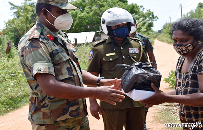 Dry ration packs and cooked meal packets were distributed among 11 low income-group families in Agbopura Grama Niladari Division, enough for more than 50 family members on 15 June on the instructions of the General Officer Commanding, 56 Division and under the supervision of the 563 Brigade Commander.