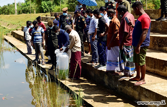 7 Sri Lanka Light Infantry Regiment meanwhile released a shoal of fingerlings into Dryarukulam tank in order to support fishing efforts of some 22 families with 77 members since fishing remains the main source of income for them. In the meantime, 6 Sri Lanka Sinha Regiment troops also released a large shoal of fingerlings to Vishuwamadu tank bank for the benefit of some 30 families with 110 members in the area.