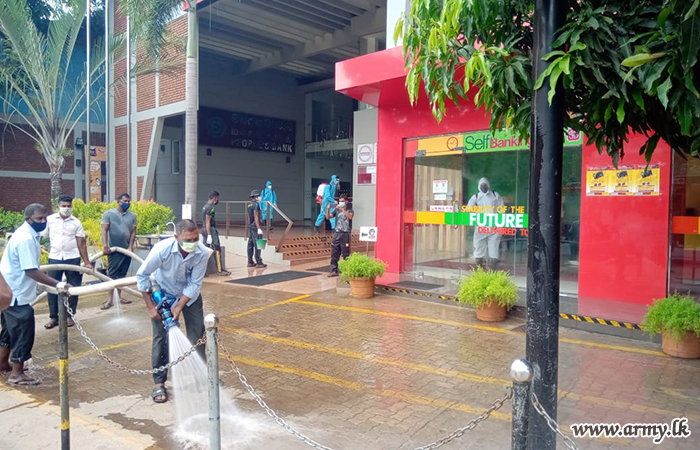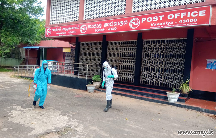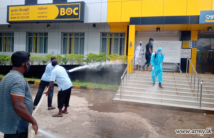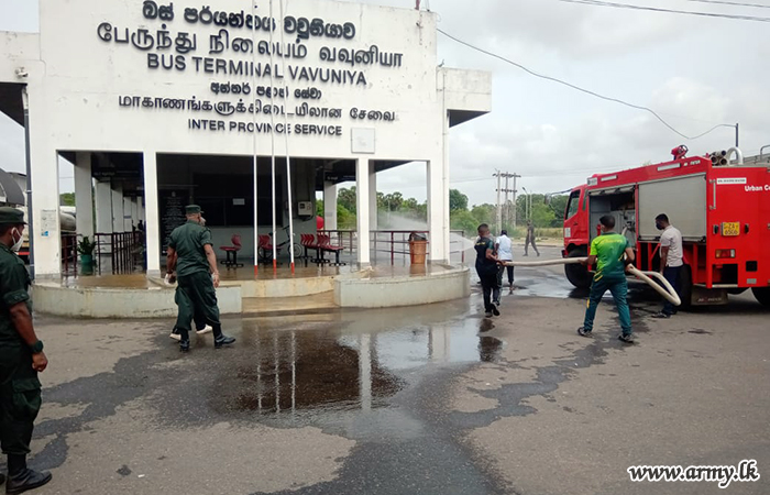 The programme conducted under the supervision of the Commander 562 Brigade Brigadier Senaka Premawansa sterilized public places such as bus stands, railway station, welfare centers, state and private banks, market places, general hospital compound, government and non-governmental institutions, public assembly points and three-wheeler parks, etc.