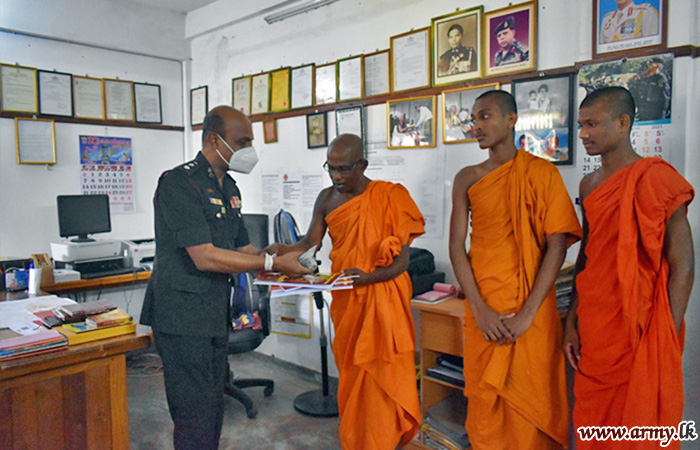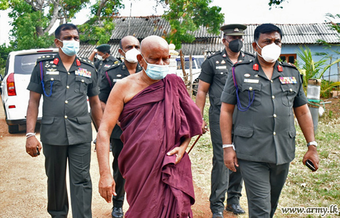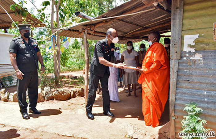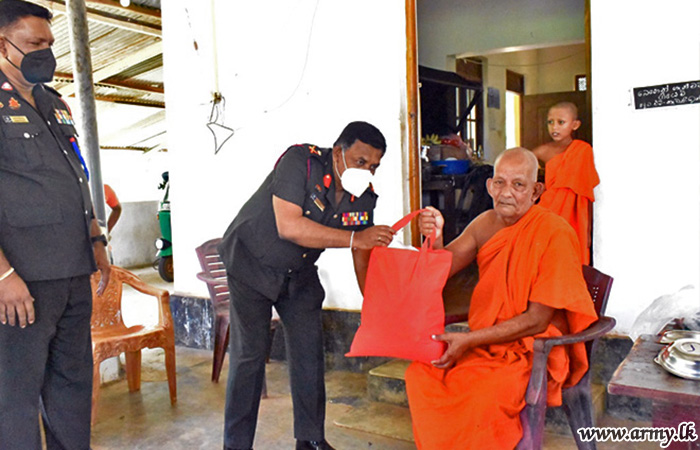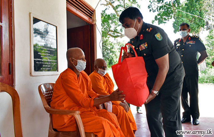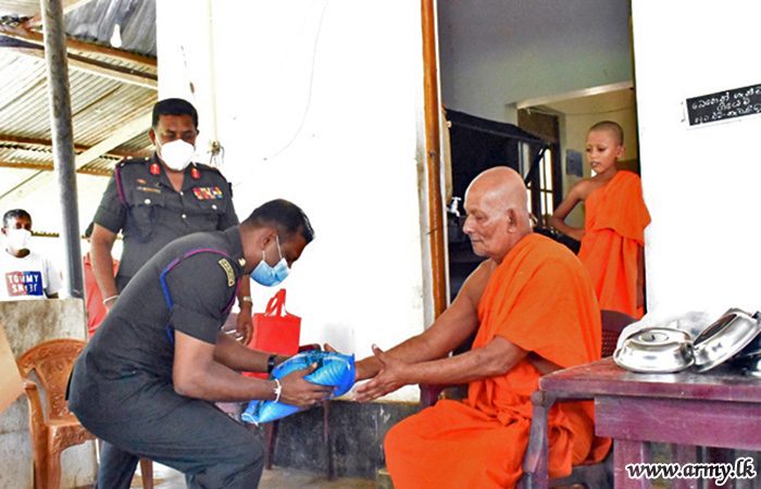 With the objective of providing relief and alleviating hardships, being faced by Buddhist monks and nuns in remote temples/monasteries due to COVID-19 pandemic and imposed travel restrictions, the 65 Division HQ troops under the Security Force HQ-Wanni on account of Poson Poya day (24) took steps to provide those places with essentials and dry rations following sponsorship, provided by an expatriate in Canada.