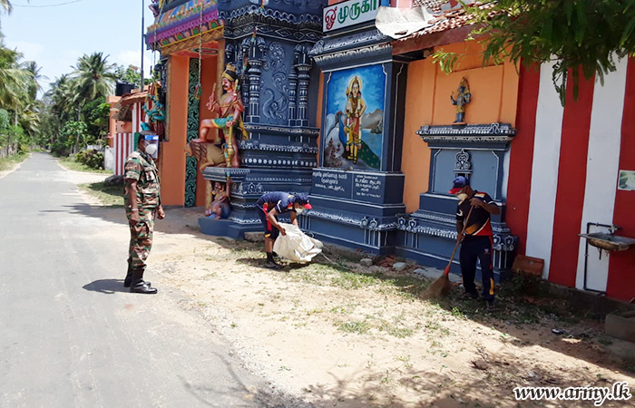 In order to promote reconciliation and goodwill between Security Forces and civilians, 513 Brigade troops of the 51 Division volunteered to carry out a few 'Shramadana' campaigns inside Muruga Murthi Hindu Kovil compound in Chankanni, Vairavan Kovil and Murugan Kovil compounds in Vadaliyadaippu, Jaffna on Friday (25) on the instructions of the General Officer Commanding, 51 Division Major General Deepal Pussella, along with the supervision of the Commander 513 Brigade Brigadier Mohamad Fariz.