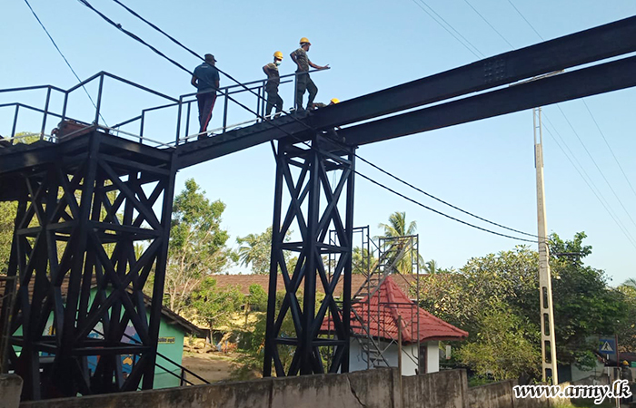 Responding to a directive given by HE the President, technically-qualified troops of the 4 (V) Sri Lanka Engineer (SLE) Regiment within a few months erected an overhead bridge for Middeniya Primary School students, considering the safety of students who often cross the main road between the primary and the secondary school, situated astride of the main road.
