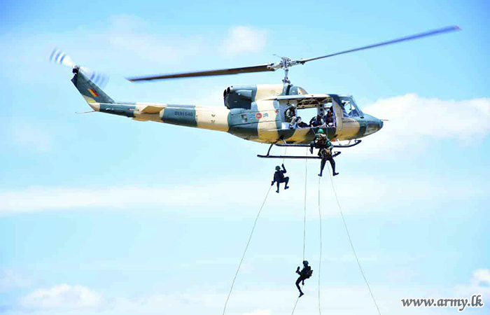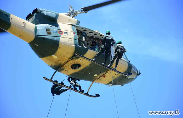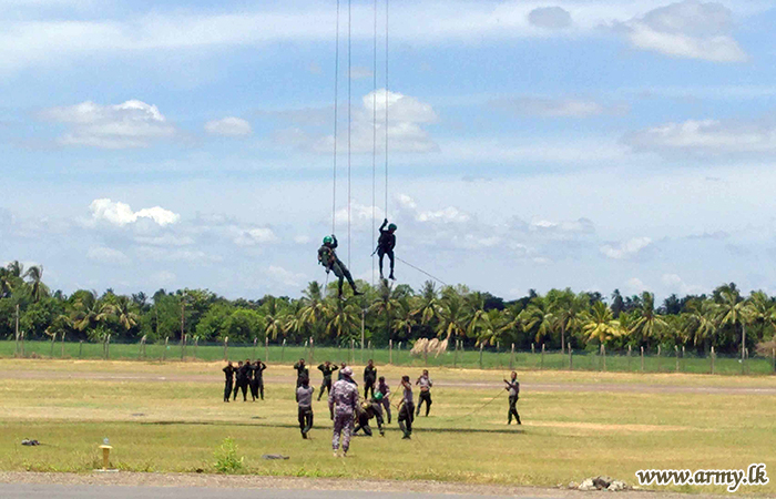 The troops of the Air Mobile Course No: 23 which was recently started at the Air Mobile Training School in Nikawewa are now undergoing Heli Rappling Training sessions at the Air Force Base - Hingurakgoda during 7-9 July.