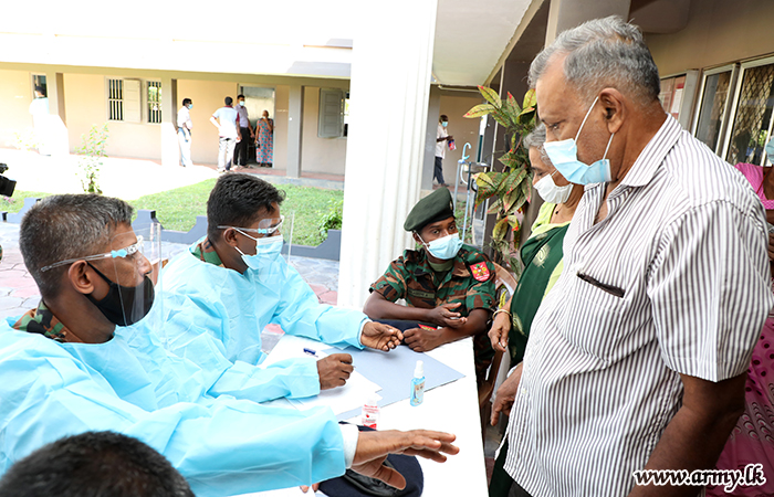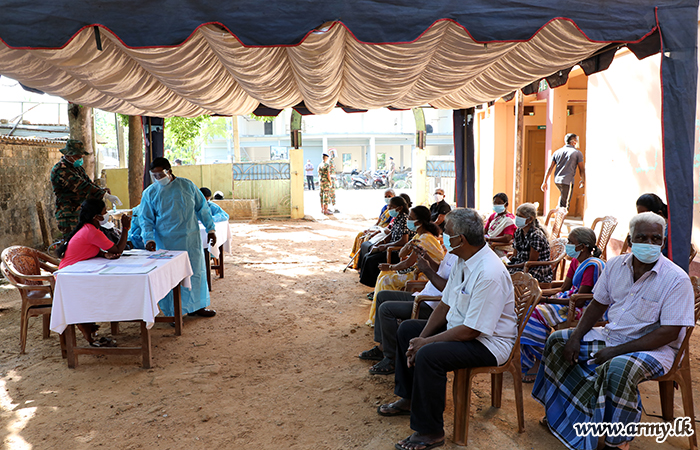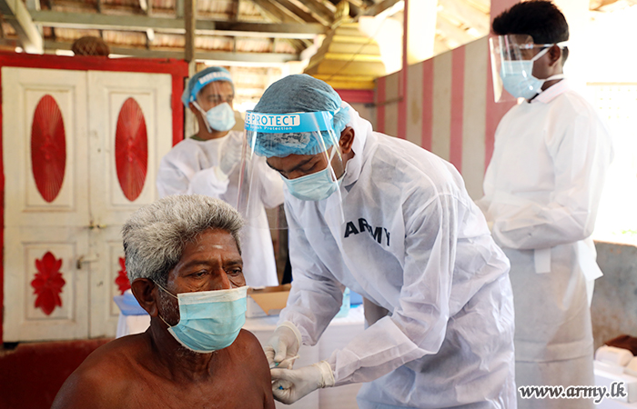 Accordingly, new Community Vaccination Centers, set up at 19 places covering the area of Jaffna town, Chankanai, Sandilipay, Velani, Uduvil, Kopay, Maruthankerny, Nallur, Thelippalei and Chavakachcheri began the vaccination of civilians over 60 years of age in the Jaffna peninsula at first. During four days (5-8 July), troops inoculated 24,182 people above 60 years as decided upon by the Epidemiology Unit and health authorities.