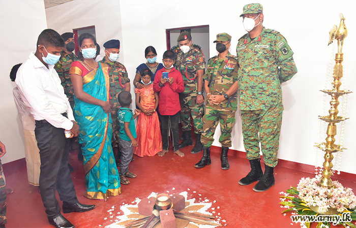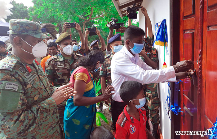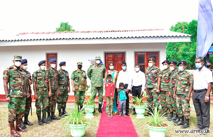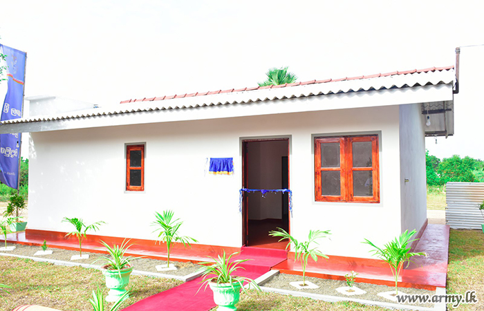 Mrs. Nagulesapullai Kuganeshwari of Konavil west, Kilinochchi, thanks to the financial support and manpower assistance of the Army was the most recent beneficiary of the Army-pioneering House Construction Project for Needy civilians in the region as per guidelines given by the Army Chief to all SFHQs.