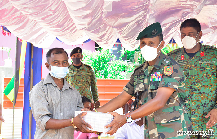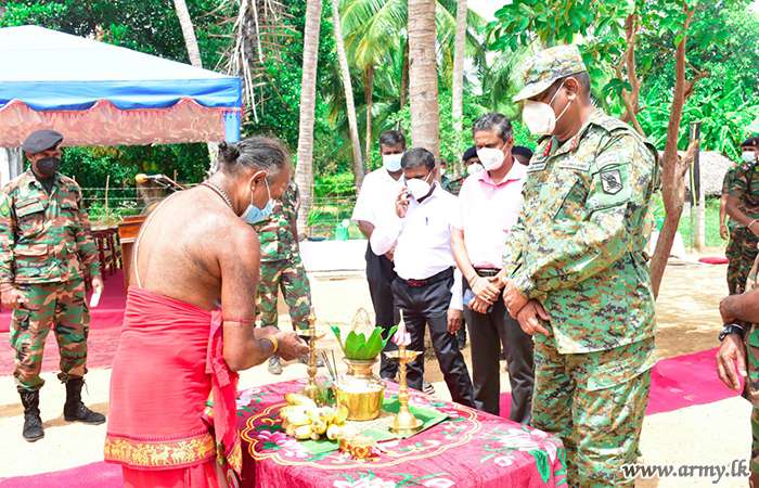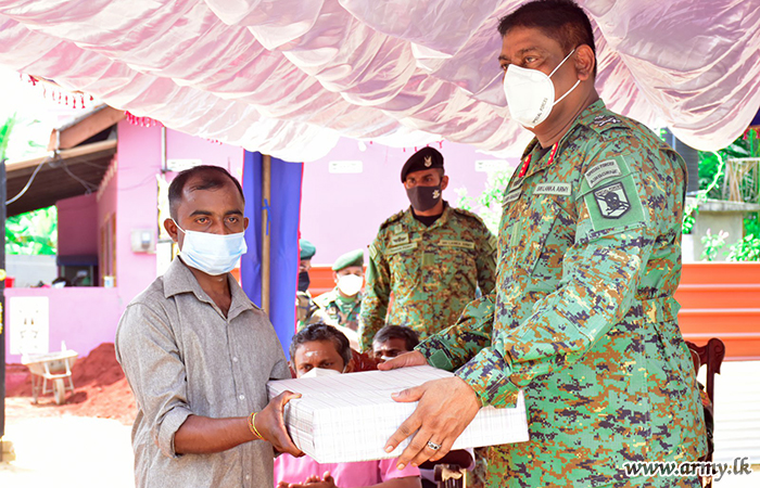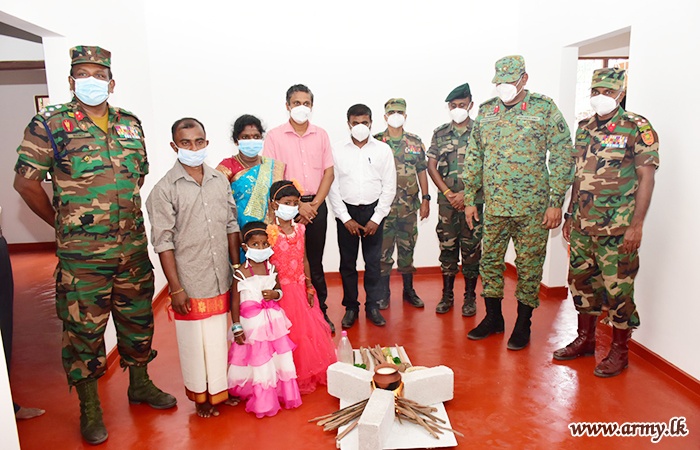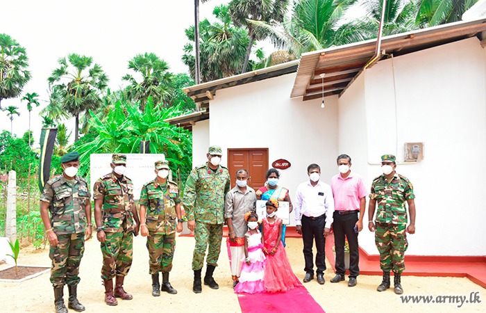 In keeping with Hindu traditions, Major General Harendra Ranasinghe, Commander, Security Forces Kilinochchi as the Chief Guest, together with the Divisional Secretary for Karachchi and Kandawalei, General Officer Commanding of the 57 Division Major General Priyantha Jayawardana, Commander 571 Brigade, Brigadier Dammika Welagedara, Commander 573 Brigade, Brigadier Manoj Madurpperuma, Other Ranks who accomplished the project unveiled a plaque on the house and vested it in the beneficiaries amidst simple rites and rituals. The arrangement got underway adhering to all COVID-19 preventive measures.