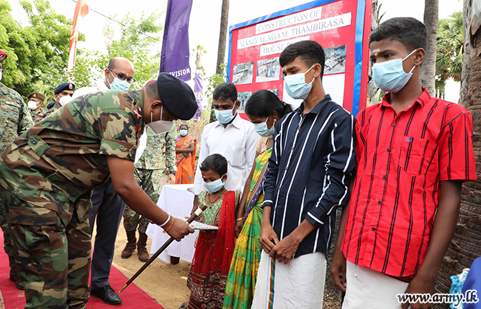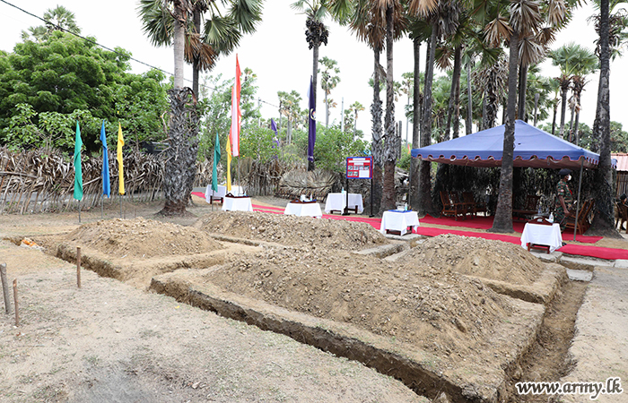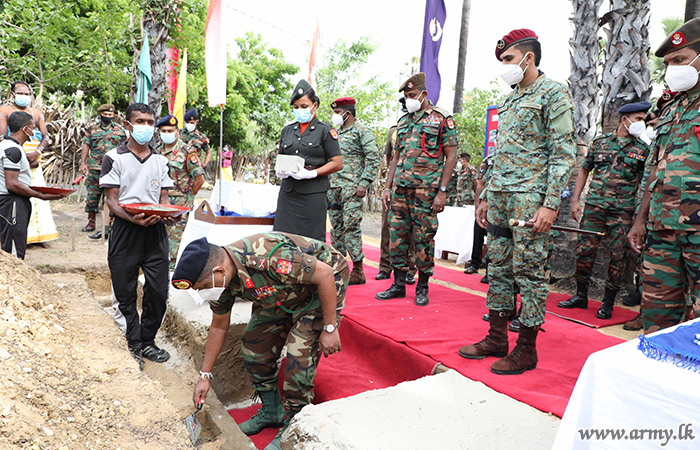 During a brief ceremony organized by 513 Brigade troops on Tuesday (13), the Commander Security Forces - Jaffna, Major General Priyantha Perera, amid religious blessings laid the cornerstone to construct one more new house for the family of Mr Thambirasa Maniyalagan after identifying the miserable living condition of the family, living in the general area of Karainagar, Jaffna.