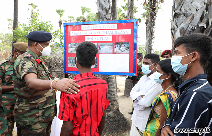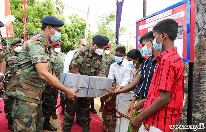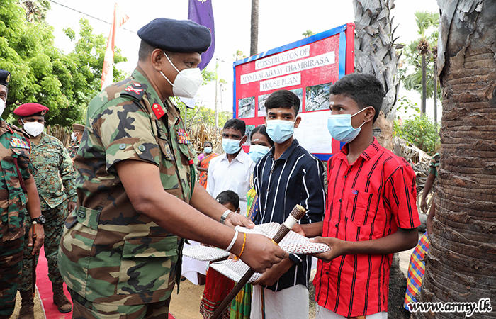 Troops of 11 Sri Lanka Light Infantry would provide manpower and technical expertise for the construction work which would begin under the supervision of the Brigadier Mohammed Farez - 513 Brigade Commander. After the foundation-laying ceremony, the Commander Security Forces Jaffna distributed dry ration packs to the potential beneficiary of the new house. In addition, Major General Priyantha Perera gifted a stock of school stationery for the use of children in the family on the same occasion.