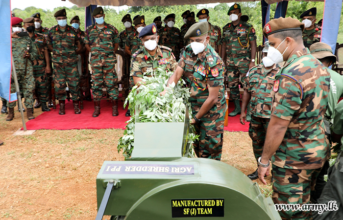 The “Agri Shredder PP1" machine that could pulverize tree leaves and branches to produce organic fertilizer, manufactured by 4 Sri Lanka Army Electrical & Mechanical Engineers (SLEME) and 5 Corps of Engineer Service (CES) troops was formally launched for the use of Jaffna troops, engaged in organic fertilizer production on Sunday (18).