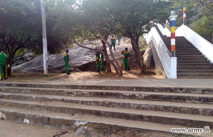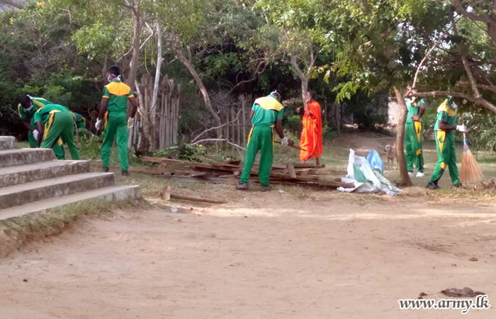 The ancient Krinda Rajamaha Vihara premises was thoroughly cleaned by troops of the 23 Gajaba Regiment under command to the 122 Brigade of the 12 Division under the Security Forces - Central in a 'Sharmadana' campaign during 15 -22 July in Kirinda.