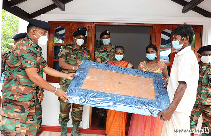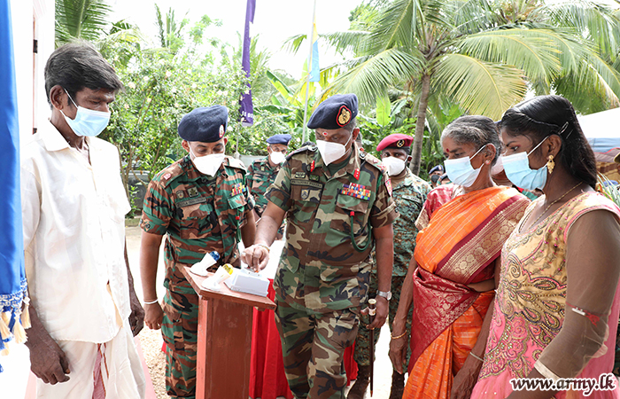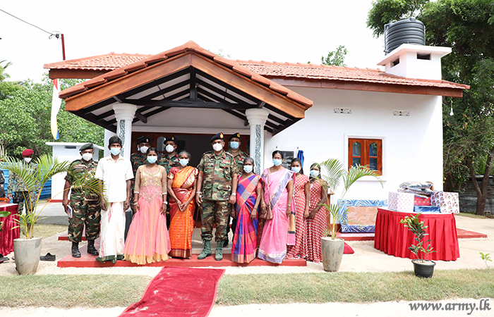 Troops of the Security Forces-Jaffna constructed one more new house for a deserving family at Chulipuram, Jaffna with financial support, granted by the National Housing Development Authority (NHDA) and handed over keys of the new house to the beneficiary, Mr Kadiran Govindasamy on Tuesday (13) during a simple ceremony, held amid Hindu religious rites and rituals.