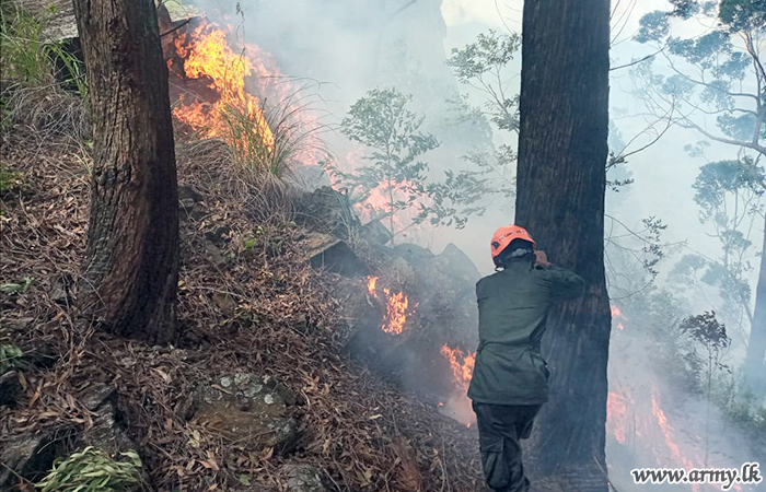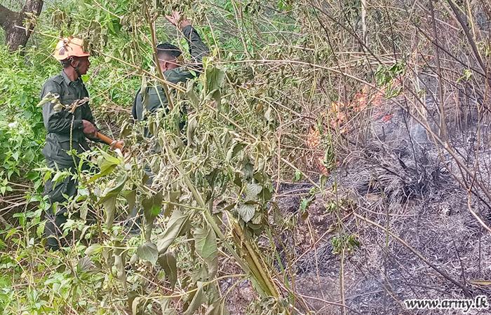 Troops of the 8 Gemunu Watch and SLEME Base Workshop at Udawalawa under command to the Security Force Headquarters - West took prompt action to extinguish a bush fire that erupted inside the Halpe Forest Reserve in the Imbulpe Divisional Secretariat area on Friday (23).