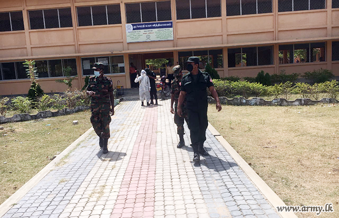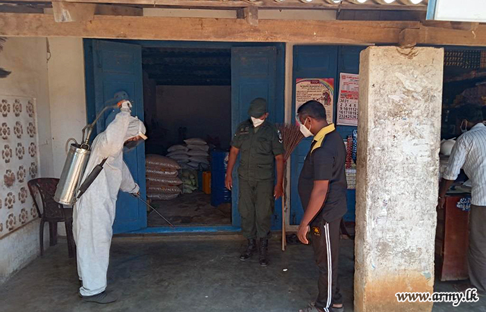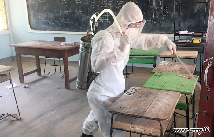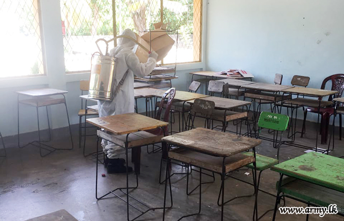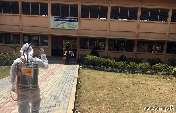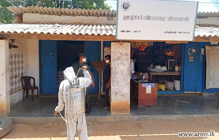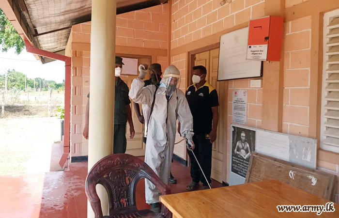 Accordingly, 7 Gemenu Watch troops covered Bharathi Maha Vidyalaya, Walli Punam Grama Niladhari Division and 9 Sri Lanka National Guards disinfected Sughandhi Puram Grama Niladhari Office, Udayarkattu North GN Division Office, Cooperative shop at Sugandhipuram and Cooperative Shop at Udayarkattu North.