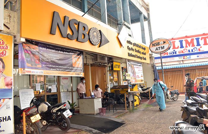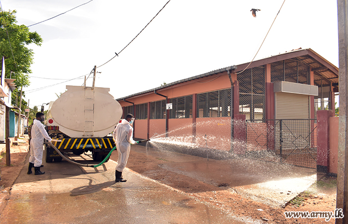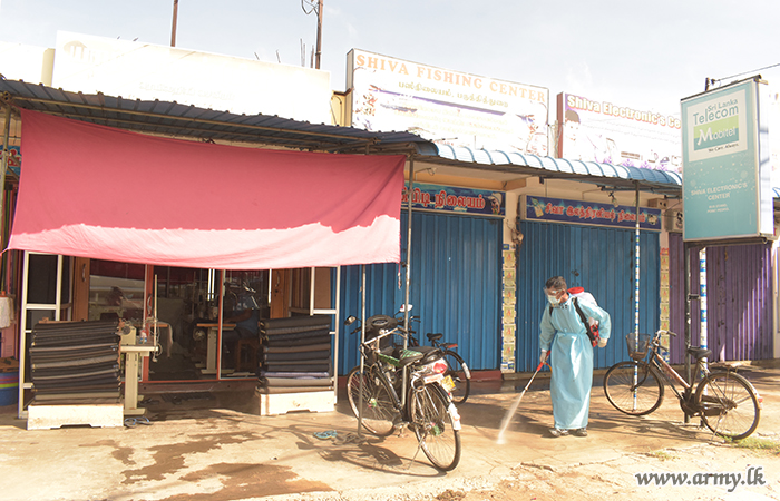 Troops of the 551 Brigade recently carried out a sterilization programme in Point Pedro town when the town was re-opened for the general public after a COVID-19 lockdown of 14 days.
