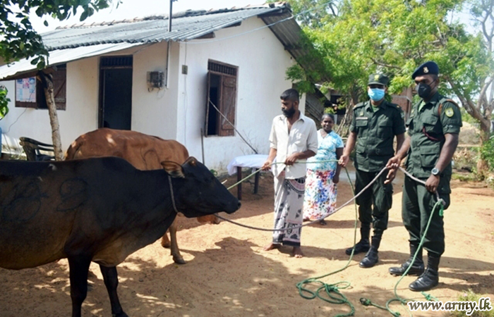 Troops of the 22 Vijayabahu Regiment (VIR) of the 222 Brigade under the 22 Division of the Security Force HQ- East donated two cattle to a low-income family in Trincomalee District on Saturday (07) in order to give a helping hand to improve their livelihood.
