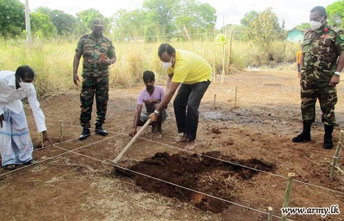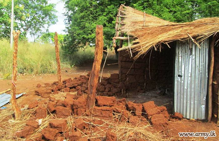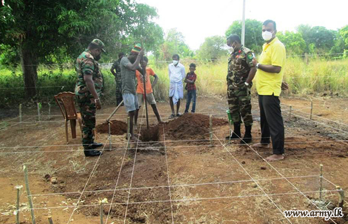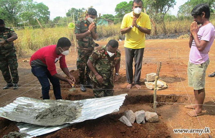The new house construction is to be sponsored jointly by Messrs Eranda Maldeniya, Nadeera Jayasinghe, Lalindu Samaraweera, Janaka Bandara, Pethum Ruhunage and Ajintha Gunasekara at the request of the Commander - FMA -North Central, Brigadier Himal Guruge who laid the corner-stone for its construction on Monday (9).