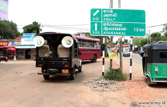 A public awareness programme on COVID -19, its prevention and precautionary measures was launched in the Jaffna peninsula jointly by 51, 52 and 55 Division troops on the instructions of the Commander, Security Forces-Jaffna and District Coordinator of COVID-19 Control and Prevention in Jaffna, Major General Jagath Kodithuwakku on Saturday (14).