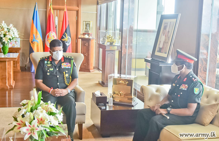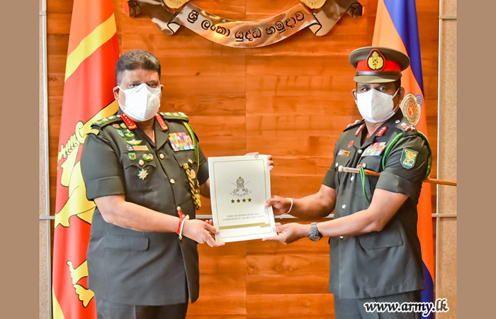 Major General Nandana Dunuwila of Gemunu Watch GW), the former General Officer Commanding of the 56 Division on the verge of his retirement from the Army after a committed service of more than three decades was invited to the office of the Chief of Defence Staff and Commander of the Army, General Shavendra Silva this morning (19) in order to receive appreciative commendation and best wishes of the Army Chief.