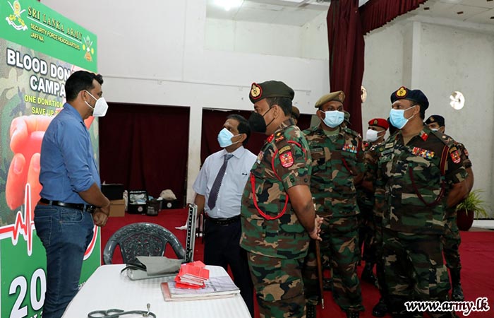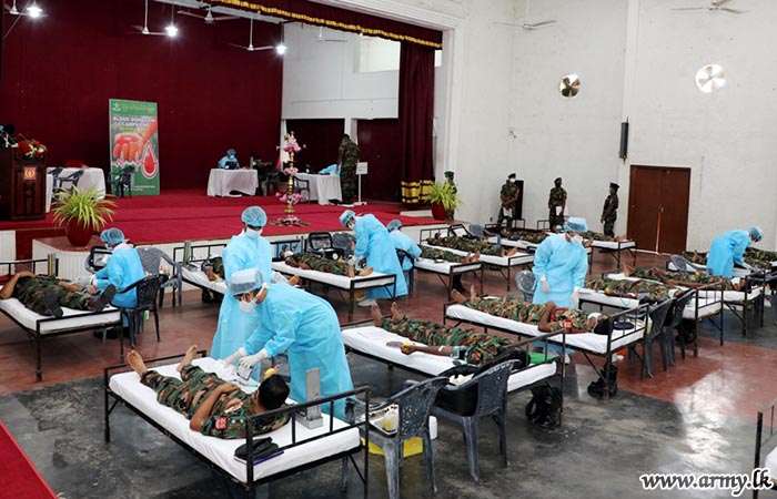 This programme was carried out by 4 Sri Lanka Army Medical Corps (SLAMC) troops with the assistance of doctors and medical staff at Jaffna Teaching Hospital. A total of 100 troops, including Officers donated blood on the guidelines given by the Commander, Security Forces -Jaffna, Major General Jagath Kodithuwakku.