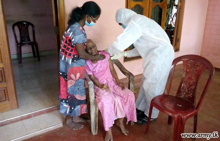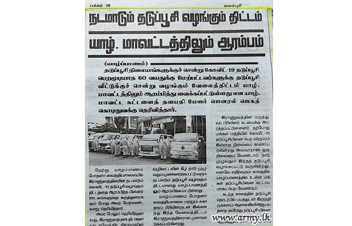 Ordinary civilians and recipients of the vaccine are full of praise to the Army for the arrangement and the mobile vaccination drive expects to cover the whole of the peninsula within a few days after vaccinating the entire elderly population in the peninsula in close collaboration with MOH offices, PHIs, Grama Niladaris (GN) and respective other agencies.