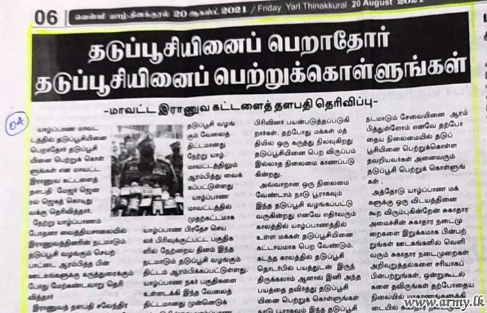 One Dr Umasugi Nadarajah, an Australia-based health professional currently in Jaffna has gone on record commenting on the ongoing Army mobile vaccination project in the peninsula while extending his deep appreciation. He was among many civilians who had been quoted saying: "I really appreciate the decision to do home to home mobile vaccination programme. It's very convenient to the elderly people who may need to depend on someone to get to vaccination centres. This programme will also help prevent the infection rates as there won't be people standing in queues. It will also do a world of goodness for reconciliation between our communities as this is a friendly approach by the Army”.