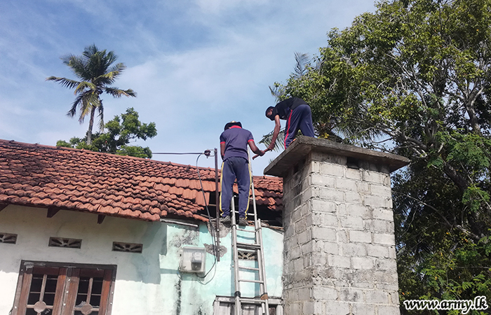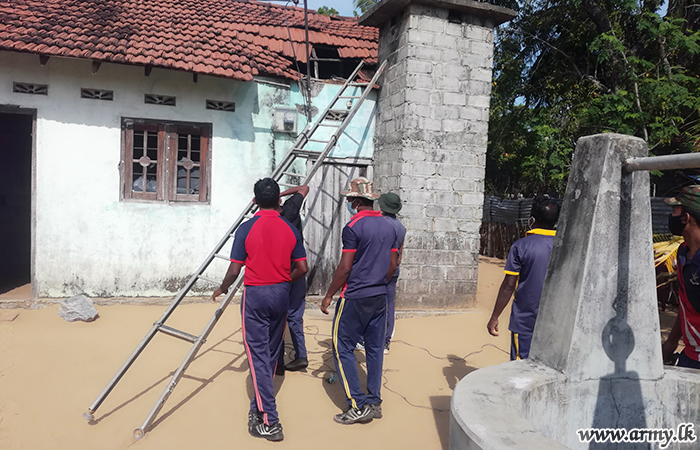 Within two days of time, the damaged roof was renovated by the troops of 233 Brigade under command to 23 Division and the Security Forces-East handed over to the owner on Monday (06).
