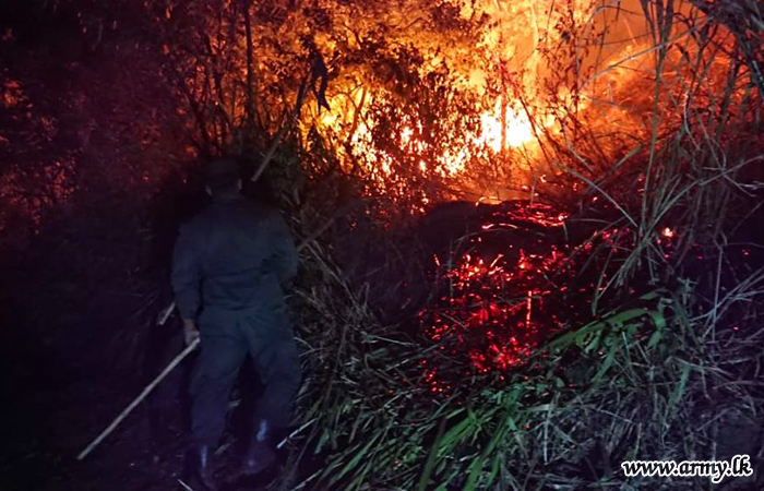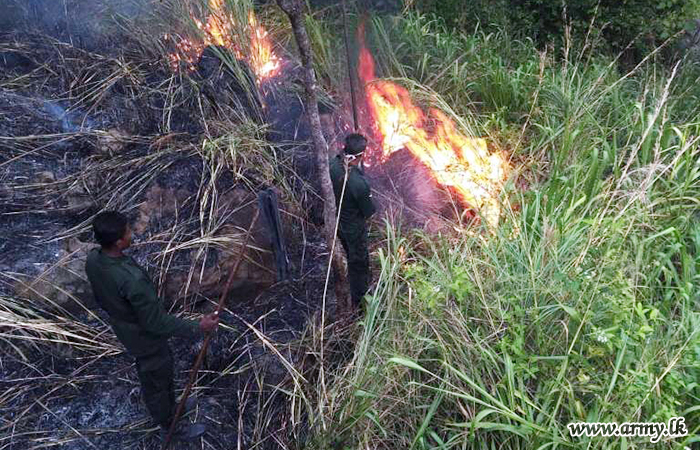 Troops of the 121 Brigade once again quickly responded to an SOS appeal and controlled a sudden bush fire that erupted in the general forest areas of Degalaraba Kanda and Mahagodayaya in Degalaraba Forest Reserve in Kumbukkana in Moneragala District after the public alerted the troops to the fast spreading fire on Sunday (12).