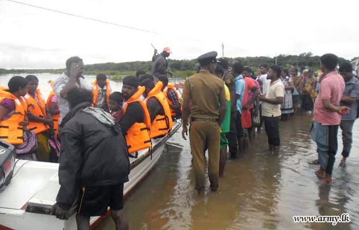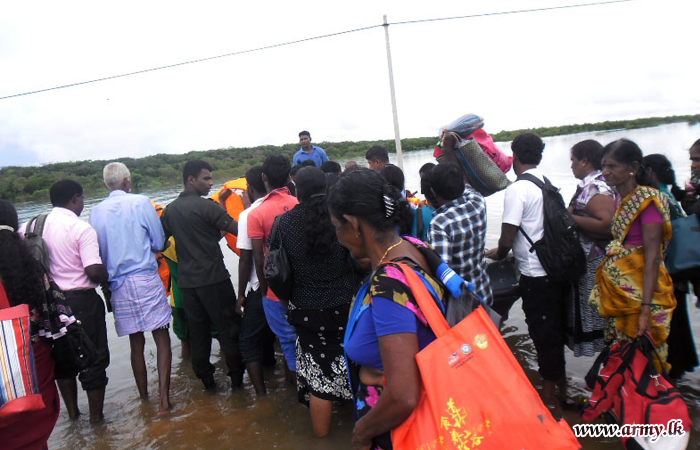 Troops serving under the 66 Division of the Security Force Headquarters - Kilinochchi (SFHQ-KLN) in close cooperation with Navy, Police and members of local fisheries societies in Valaipadu, promptly assisted flood-affected and stranded civilians in inundated areas along Jaffna-Mannar road (A 32) as rains worsened during early this week.