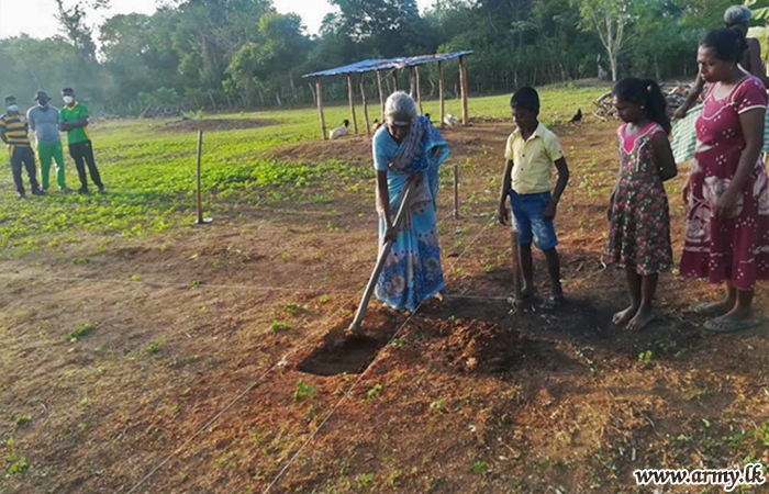 On being informed of the plight of these two families, the Commander 653 Brigade, Brigadier Sudantha Fonseka took the initiative to this effect. The guidance of the General Officer Commanding, 65 Division, Major General Anil Samarasiri enabled the troops to coordinate with the Divisional Secretariat in Madu for purchase of raw materials as troops were ready to build those houses.