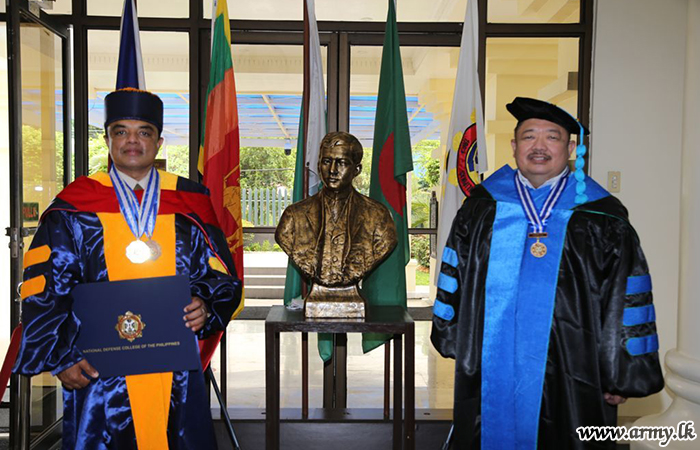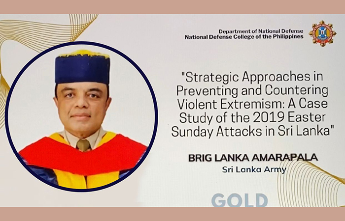 The National Defence College (NDC) of the Philippines for the first time in its hitory has awarded both Gold Medal for the Best Thesis and the Bronze Medal for Academic Excellence in the Masters’ Course (National Security Administration Regular Course-56 2020/2021) to the Sri Lankan Army Brigadier, Lanka Amarapala during the NDC’s graduation ceremony, held on Friday (17) at the NDC in the Philippines.