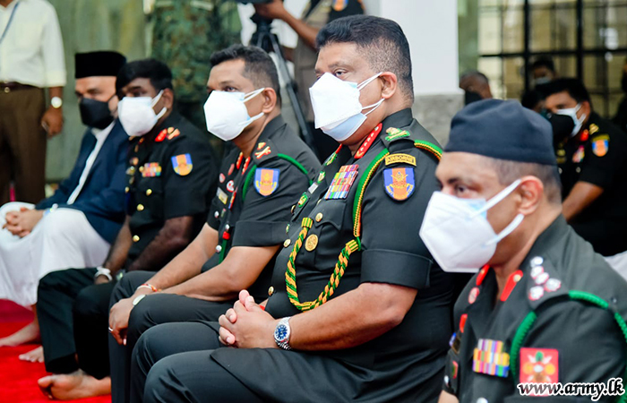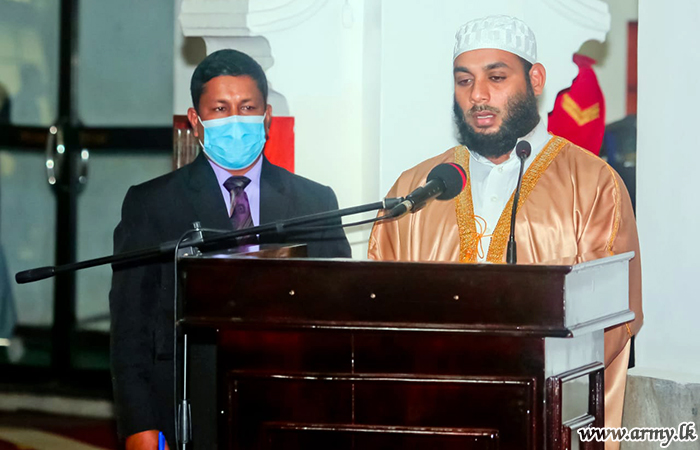 The customary Islamic religious sermon, ‘Bayan’ then invoked blessings symbolically on Army flags and the organization, lauding its services, being rendered for the best interests of the country. The Imam Moulavi, A.B.M Rizvan of Colpetty Jumma Mosque conducted the special chanting, ‘Qirath’ prayers and Moulavi Amher Hakeemdeen afterwards performed the wishful prayers, ‘Duwa’ according to the sequence of Islamic invocations.