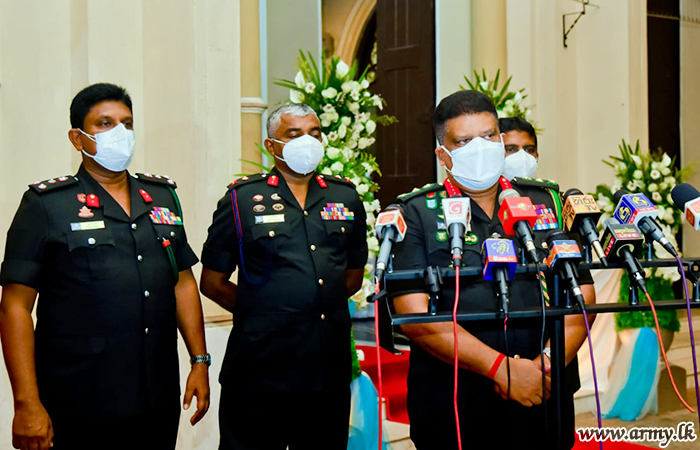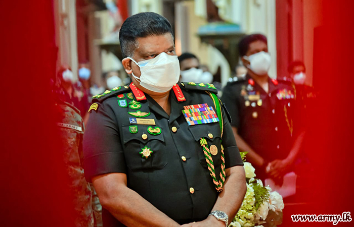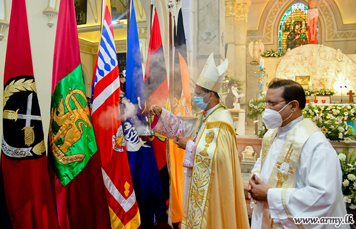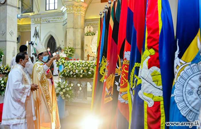 Rev. Heshan De Silva, Baptist Association, Chaplain of the Army Christian Fellowship afterwards delivered introductory comments, highlighting the importance of the commemoration of the Army anniversary and inviting everyone to join hymns. Blessings were then symbolically invoked on the Commander of the Army and all serving members, Army Flag and all Regimental Flags after the soldiers respectfully brought them inside and placed them at the foot of the altar in the holy precincts.