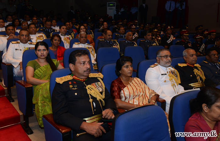 Hon Ruwan Wijewardene, State Minister of Defence graced the ceremony as the Chief Guest at the invitation of Major General Udaya Perera, Commandant, DSCSC. Past Commanders, Chief of Defence Staff, Commander of the Army, Lieutenant General Crishanthe De Silva, Navy, Air Force Commanders, members of the diplomatic corps, Defence Ministry officials, family members of graduating officers and a gathering of senior officers were also present at the occasion.