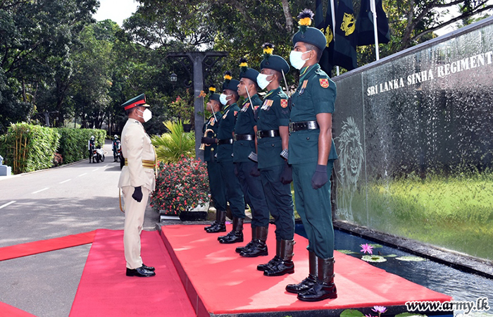 Regimental Centre troops of the Sri Lanka Sinha Regiment (SLSR) during a moving ceremony, blended with military formalities and ceremonials on Friday (8) bade farewell to their outgoing Colonel of the Regiment, Major General Hemantha Bandara.