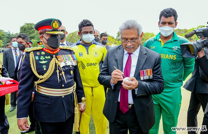 The final highlight of the Army Anniversary Day’s chain of ceremonials and inaugural events at Gajaba Regiment (GR) Regimental Centre where HE the President graced as the Chief Guest at the invitation of General Shavendra Silva, Chief of Defence Staff and Commander of the Army on Sunday (10) assumed special significance as the newly-done ‘Gotabaya Rajapaksa Cricket Stadium’ was vested in the GR troops after HE the President hit the first inaugural ball, bowled by Major Thisara Perera of GR symbolizing the ground’s inauguration.