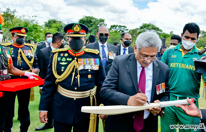 All eyes were glued to the new GR cricket ground of 5 main turfs and 4 side turfs of international standards as the President unveiled a plaque to the effect and began moving into the pitch holding a cricket bat in order to warm the new ground for a friendly encounter with the internationally-reputed cricketer, Major Thisara Perera who captained the Sri Lankan team some time ago. HE the President, now the batsman in the new pitch struck a couple of balls and left his signature on the bat as cricket veterans do, leaving memories for the occasion.