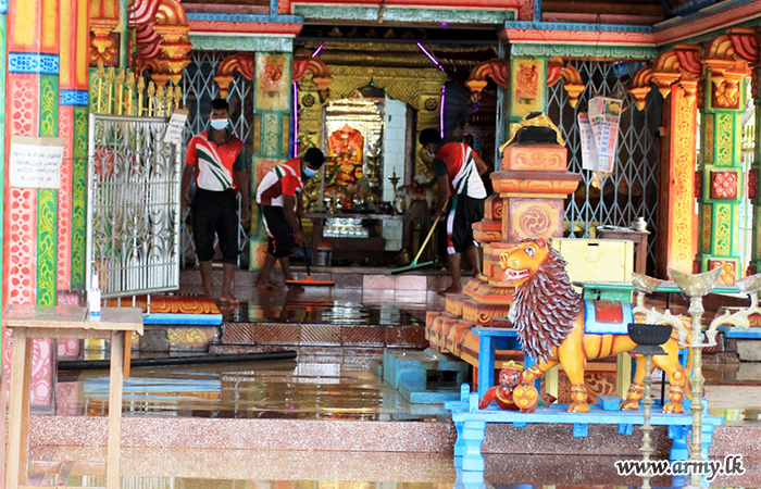 In the meantime, Selvasanidhi Murugan Kovil and Mirusuvil Sri Amman Kovil compounds in the Jaffna area were cleaned by 11 Vijayabahu Infantry Regiment troops of the 52 Division in order to rid garbage and pollutants from those crowded places. The General Officer Commanding, 52 Division, Major General Chandana Wickramasinghe gave his blessings for the projects.