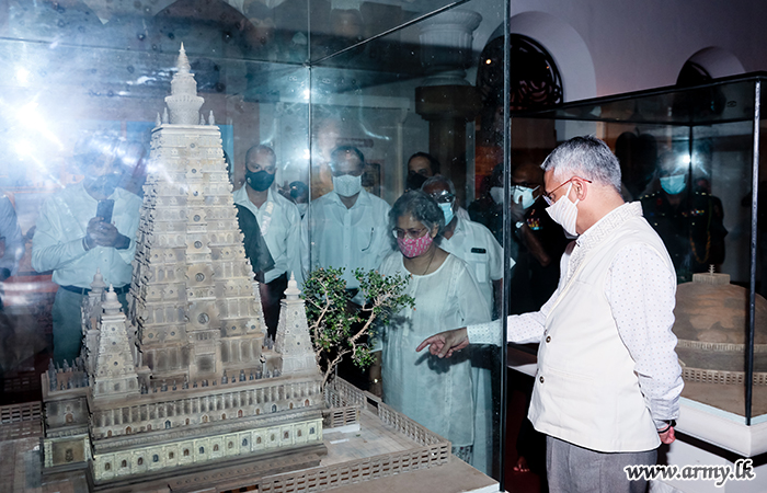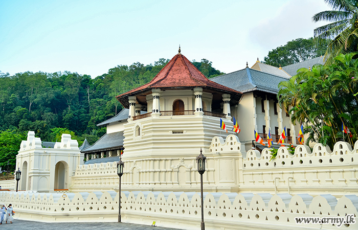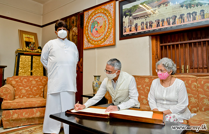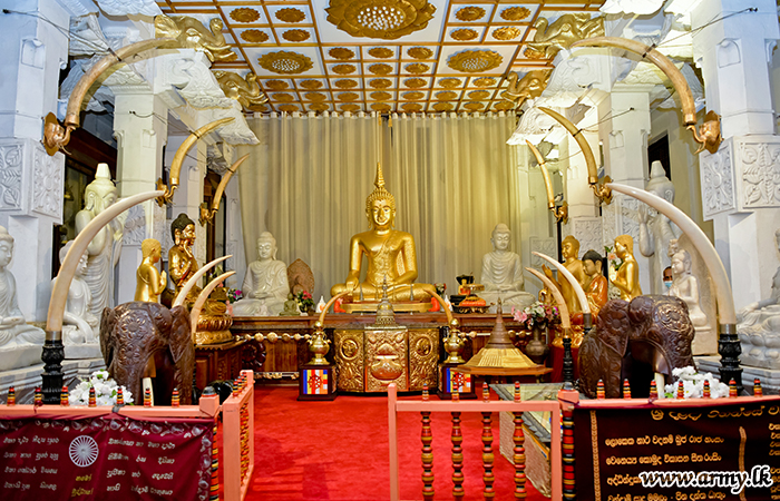 Upon arrival in Kandy, Major General Kithsiri Liyanage, General Officer Commanding, 11 Division warmly received the delegation. As dusk fell, General Manoj Mukund Naravane, the spouse, Mrs Veena Naravane, President, Army Wives Welfare Association and Indian delegates proceeded to the temple.