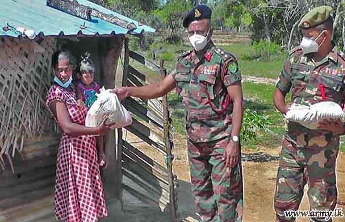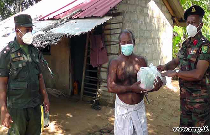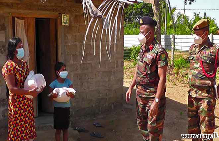 Troops of 17 (V) Sri Lanka Light Infantry (SLLI) distributed a stock of dry ration packs, sponsored by Mr Sudarshana Jayathilaka in Thenniyakulam area on Monday (18 )