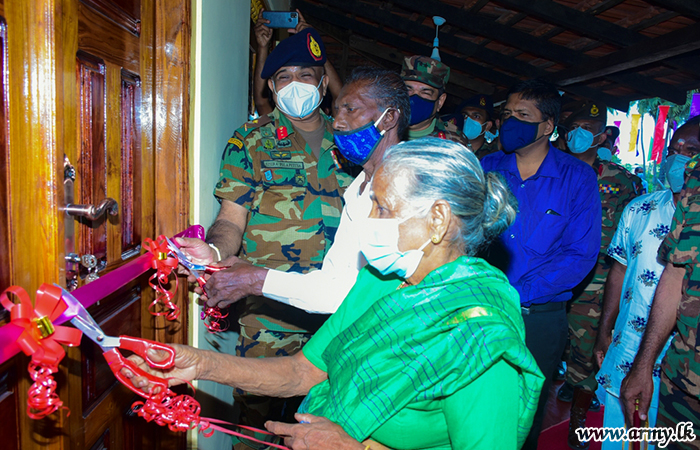 Similarly, one more newly - constructed house was vested in the needy family of Mrs R. Guganeshwari in Thevipuram on Wednesday (13) during a simple ceremony. The community welfare project of house construction was spearheaded across all SFHQs on the instructions of the Army Chief in order to support the government's ongoing housing project, meant for the homeless.