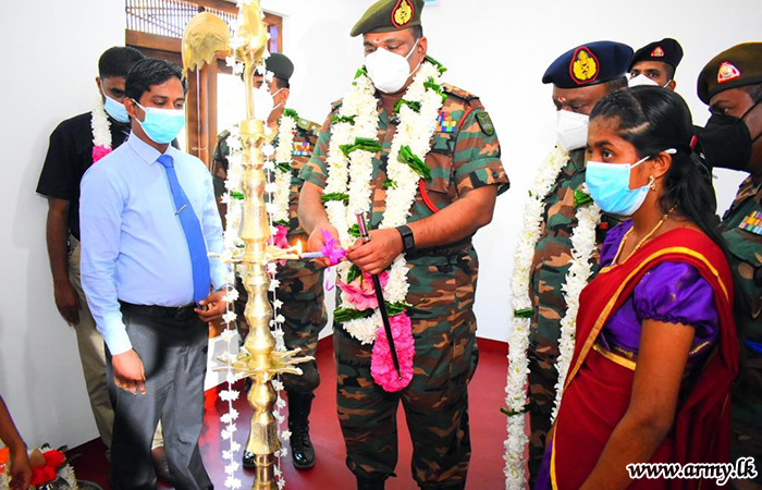 Construction of the houses was undertaken by the troops under the supervision of the General Officer Commanding, 24 Division Major General Chaminda Lamahewa and both new houses were comprised of all facilities such as sitting area, dining room, bedrooms, washroom, kitchen, lavatory, etc. In addition , a stock of essential household items, electric appliances and furniture were also gifted to both families on the same inaugural warming ceremonies in Ampara.