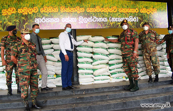 The Security Force Headquarters -East (SFHQ -E), pushing forward the government's organic fertilizer production drive as per instructions given by the Commander of the Army to all formations handed over its first SFHQ-E troops-produced carbonic fertilizer stock of 86, 961 kg, required for this year's Maha season to the Ceylon Fertilizer Company Limited (Lak Pohora) on Tuesday (26) during a simple ceremony.