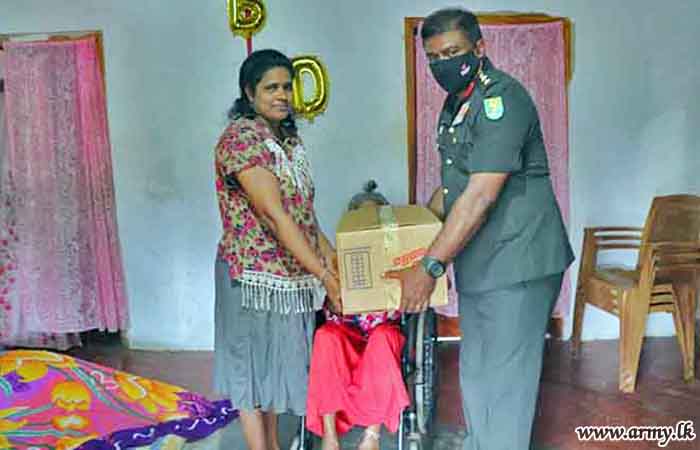 A stock of essential dry rations and a life-supporting wheelchair were donated to the helpless physically-handicapped woman, Mrs Leone Methaline of Sinnapandivirichchan area in Madu on Thursday (28) with sponsorship provided by 24 Gajaba Regiment troops of the 653 Brigade under the 65 Division HQ of the Security Force Headquarters - Wanni.