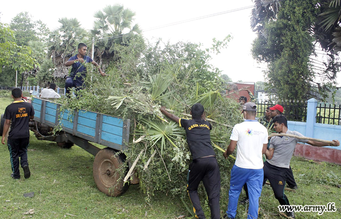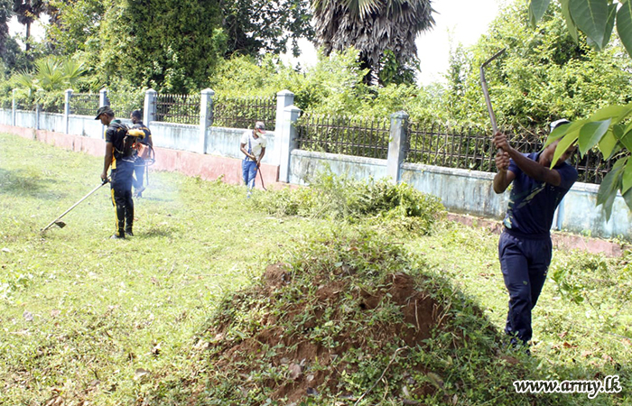 Troops of 14 Sri Lanka Sinha Regiment of the 641 Brigade under the 64 Division under command to the Security Force HQ - Mullaittivu conducted a Sharamadana campaign in Oddusudan Maha Vidyalaya compound on Thursday (28), in response to a request made by the principal.