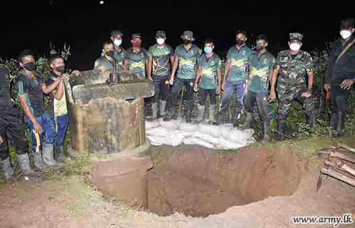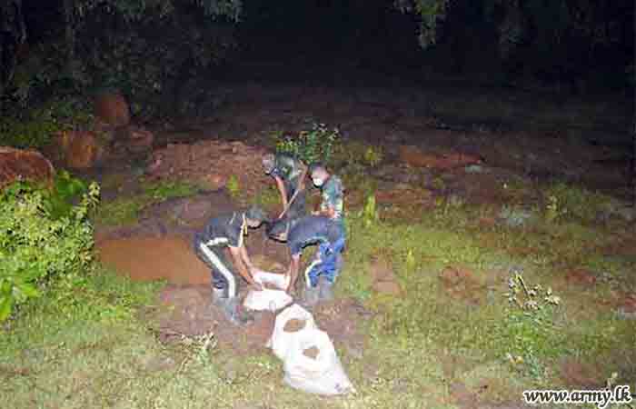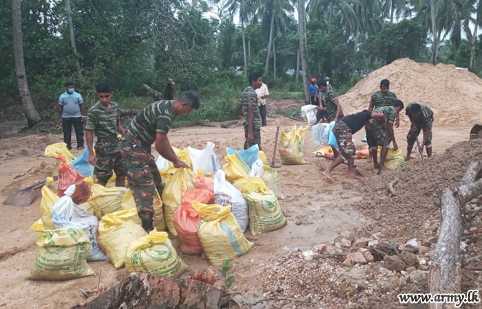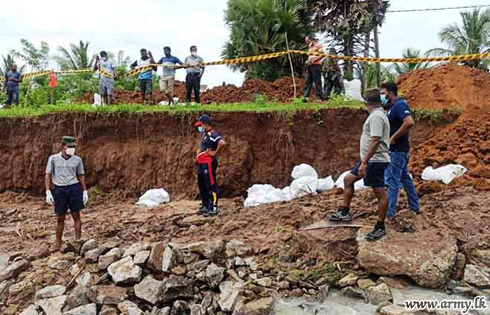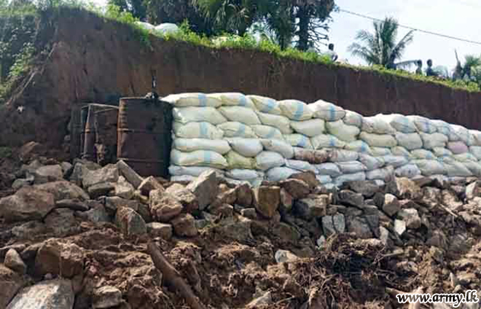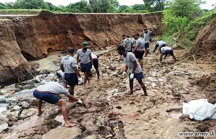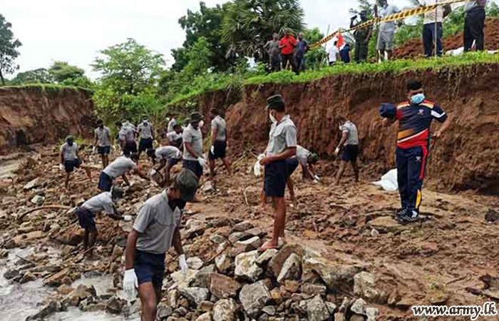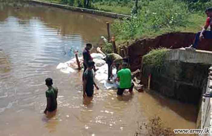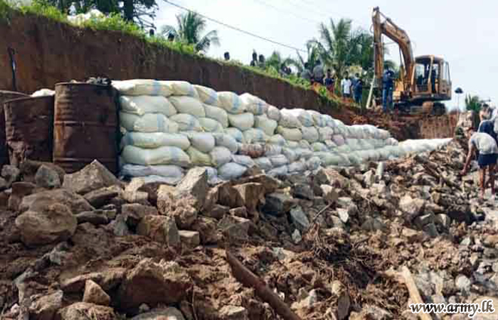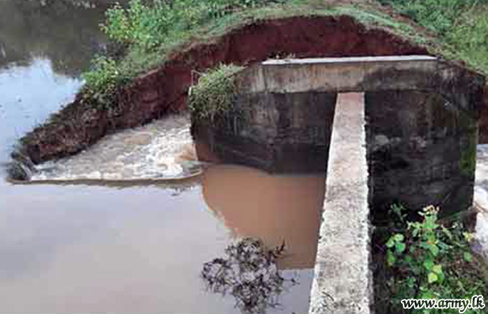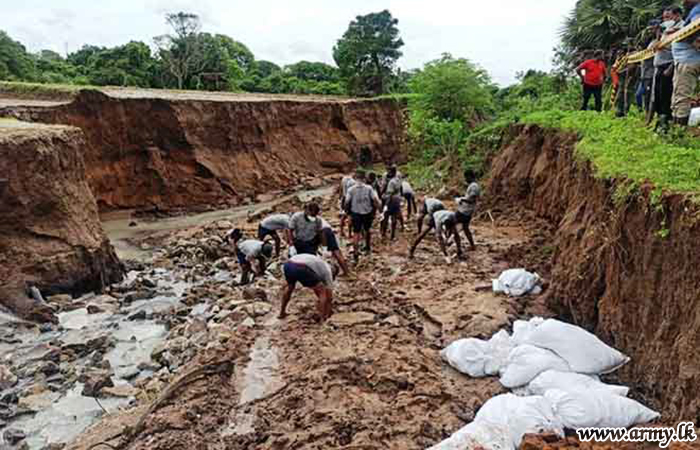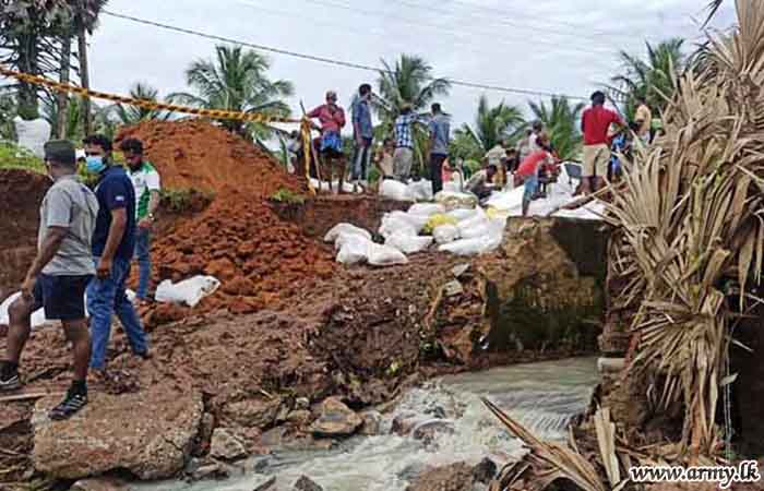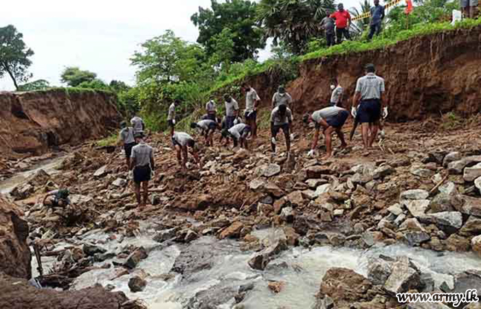 In response to a request made to the troops by the District Secretary for Mannar, the General Officer Commanding, 54 Division, Major General Dharshana Wijesekara instructed the Commander, 542 Brigade to rush 15(V) Gemunu Watch (GW) troops to the area and take necessary action to prevent further erosion of the situation as canal waters continued to spill and damage the road patch. The task was completed by Monday (8) evening.