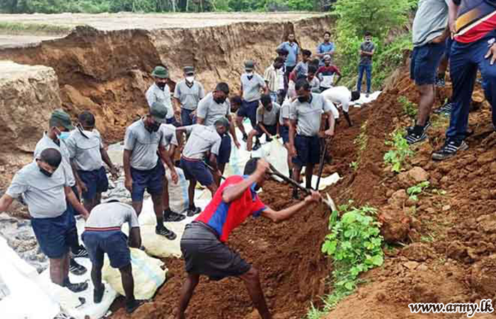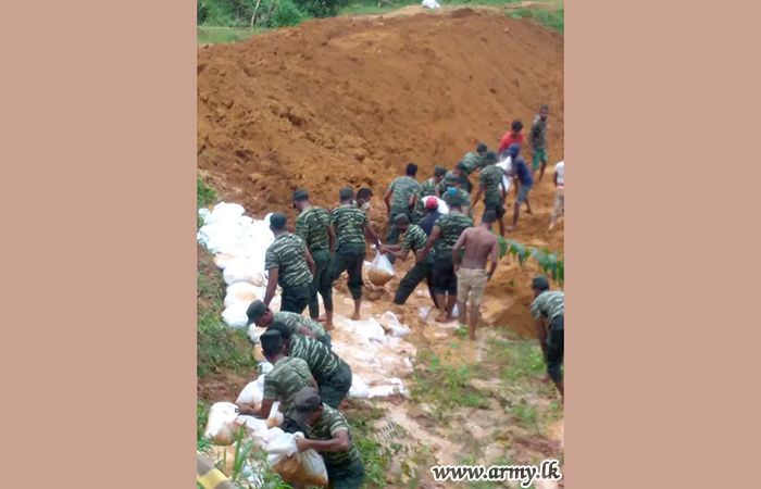 On the instructions of Major General Laksiri Perera, General Officer Commanding, 56 Division, Brigadier Panduka Perera, Commander, 563 Brigade, mobilized 21 Sri Lanka Sinha Regiment troops around midnight to take up the challenge of repairing threatened bund patches placing sandbags and plastering. The contribution of the troops enabled to avert a major disaster due to their timely intervention.
