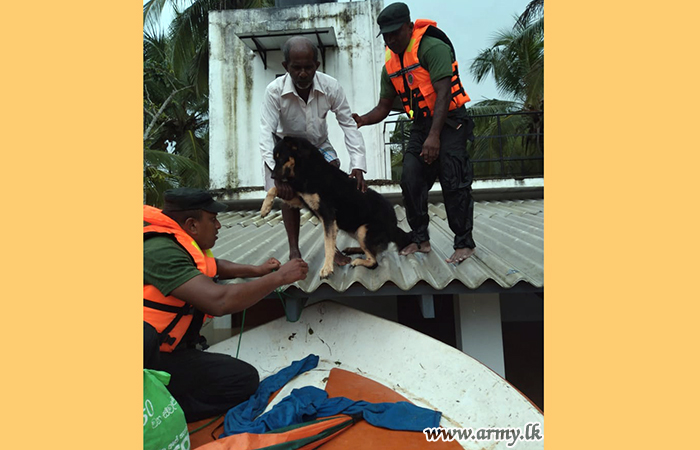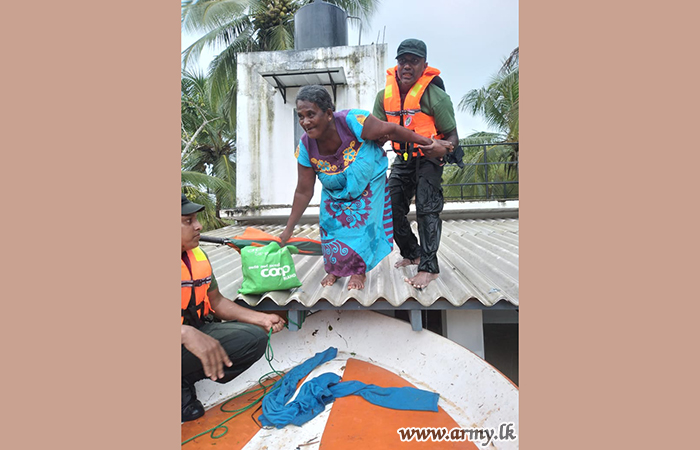 In the meantime 1 SLNG troops of the 142 Brigade and 14 Division of Security Forces- West hurried and rescued stranded family who have taken shelter on their roof of the house due to surging floods in the general area of Boyawalana in the Griulla Grama Niliadhari Division. When troops reached there those residents including women were found atop the roof and remained helpless. Troops after taking Army their rescue boats evacuated safely.