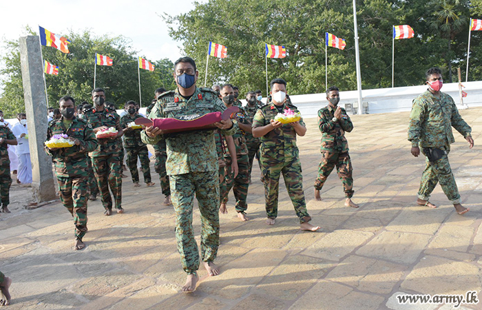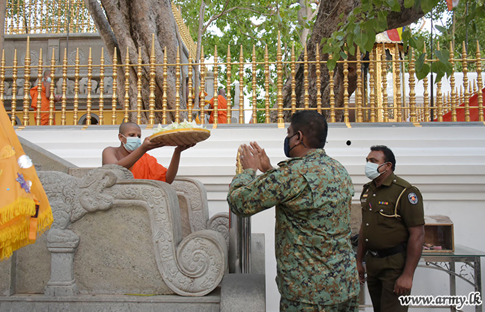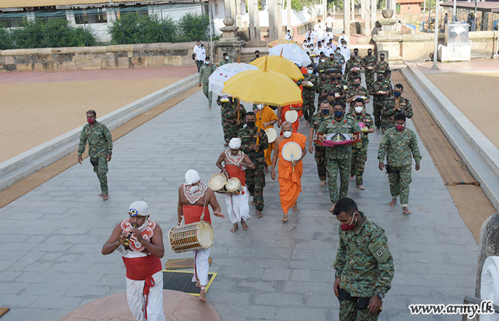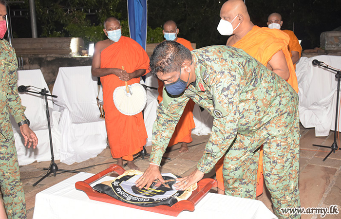 The 1 Corps flag was at first taken respectfully in procession to the upper chamber of the Stupa premises where members of the Maha Sangha invoked blessings on the flag and troops serving there. Religious observances including a Bodhi Pooja at Jaya Sri Maha Bodhiya and a special Pooja at 'Natha Dewalaya' afterwards added more significance to the invocation ceremony.